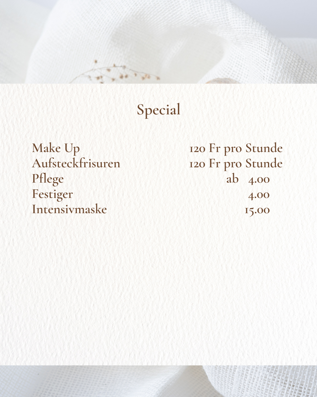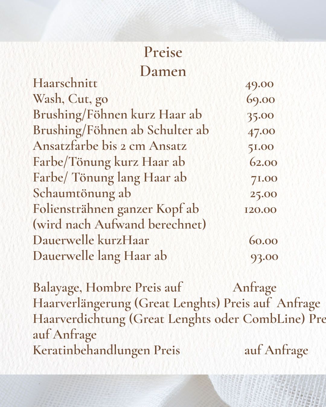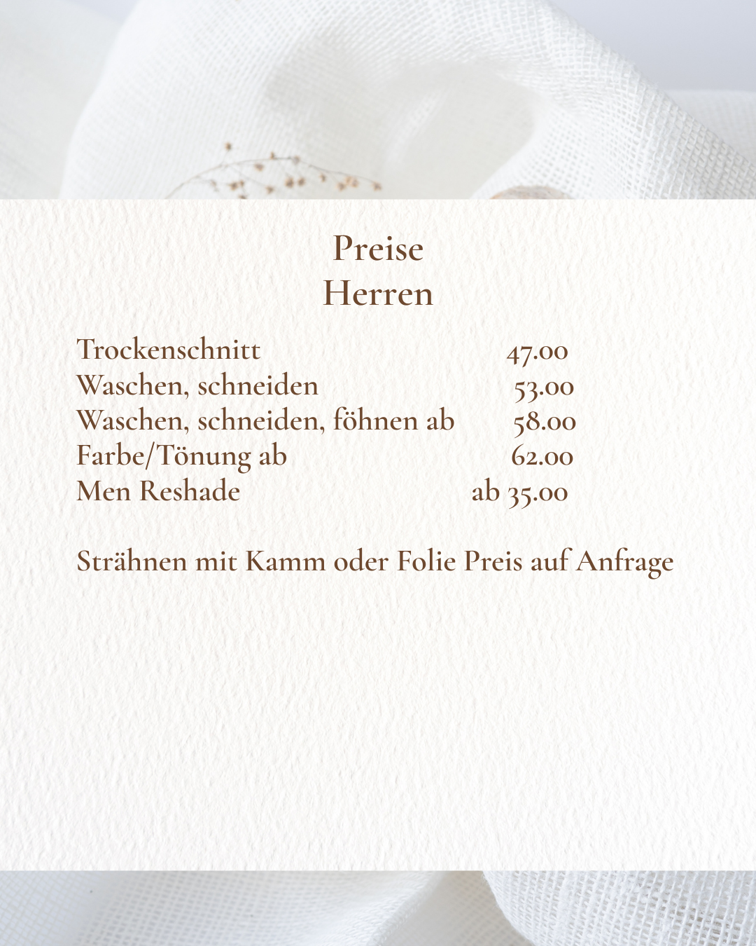 Ob für den Alltag oder einen besonderen Anlass – ich bringe Sie und Ihr Haar in Bestform. Mit unseren hochwertigen Produkten und professionellen Techniken sorgen ich für gesundes, glänzendes Haar und ein Styling, das Ihre Persönlichkeit unterstreicht. Top Styling und gepflegtes Haar in einem.